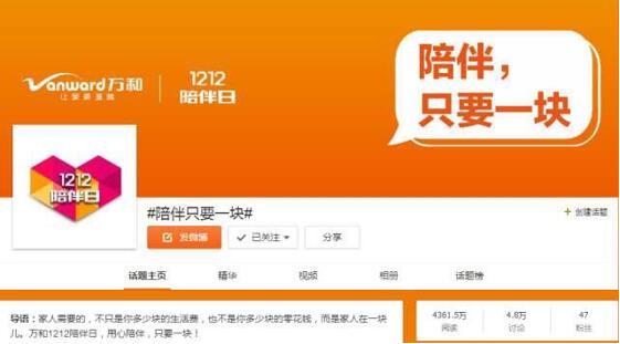 12月12日,由奇异果(中国)发起的#陪伴只要一块#微博话题,引发千万人关注,众多媒体、明星大V、社会各界人士纷纷转发相关微博内容,话题阅读量高达4000余万。